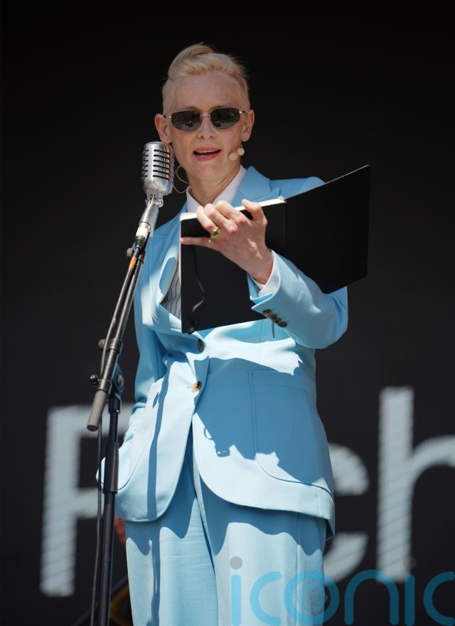 As the music began, Swinton, dressed in a sky-blue trouser suit and sunglasses, recited her lines.