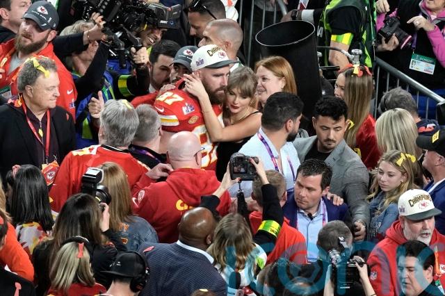 The US superstar rushed onto the field after Kelce’s Kansas City Chiefs defeated the San Francisco 49ers 25-22 in Las Vegas.