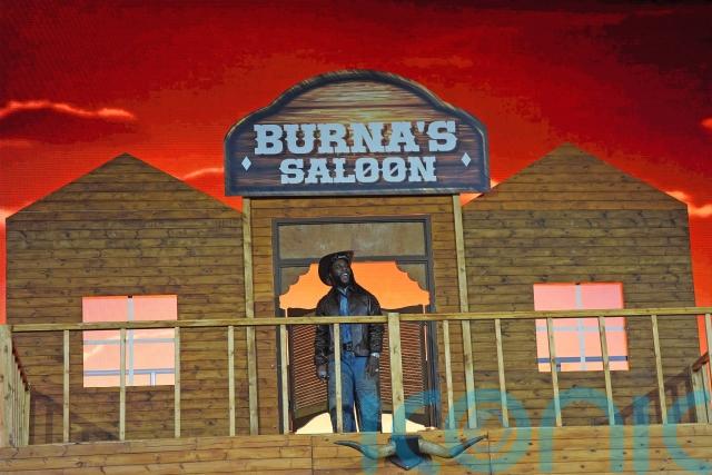 His staging featured a plastic life-sized horse on stage and a prop building on stage, named Burna’s saloon.
