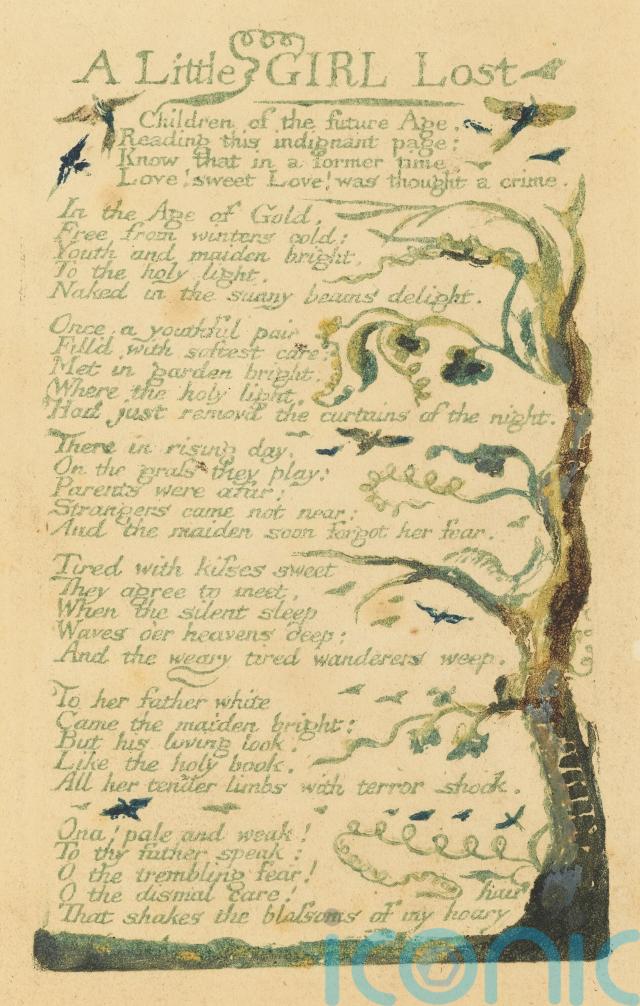 The print comes from the rare first issue of Blake’s Songs Of Experience, from around 1794, which is made up of just four copies and contains 17 of Blake’s poems, illustrated, etched and printed by the poet.