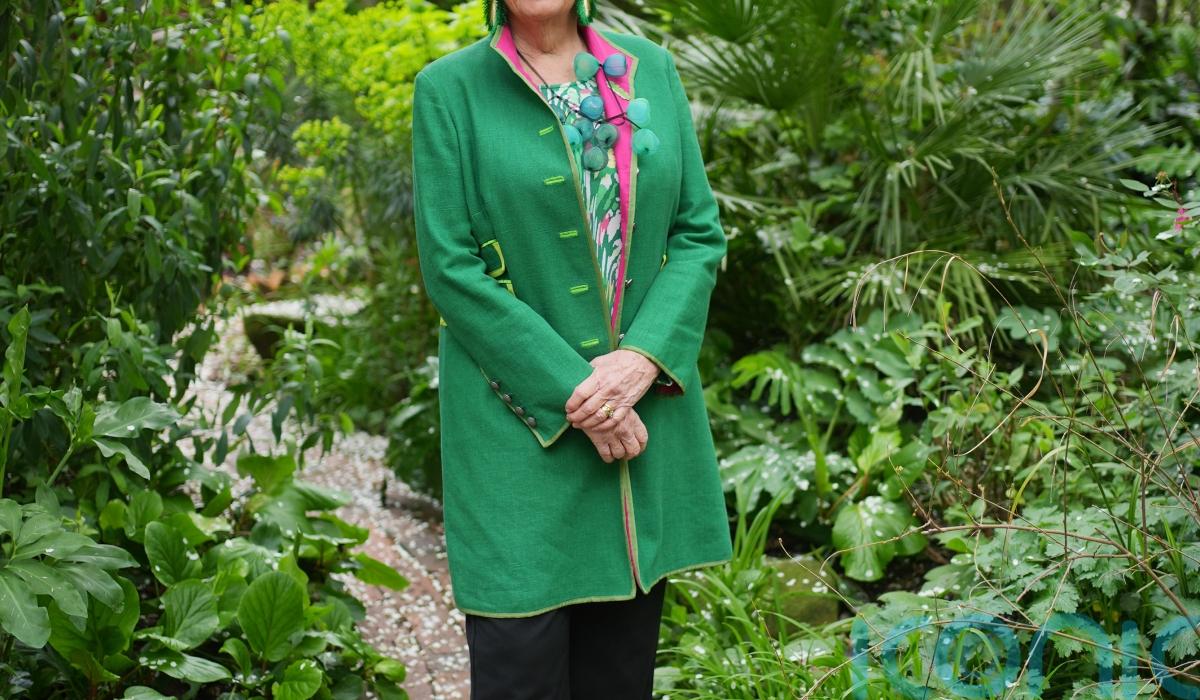 Dame Prue wore a pink ruffled shirt and orange suit, paired with an extravagant floral headpiece, as part of an ensemble created from holly, nettles, butterbur, wood clippings and recycled aluminium.