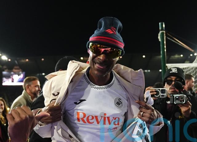 Dressed in the club’s all-white colours, with a Swansea crest on his jacket, dark glasses and a beanie hat, the rapper made a pre-match lap of honour as fans twirled their towels with rock music booming in the background.