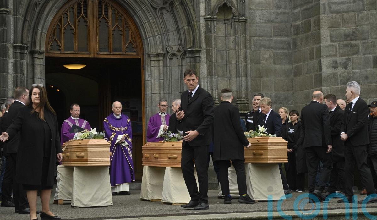 The three wooden coffins were brought to the front of St Patrick’s Church in Dundalk for the funeral mass, where a framed portrait had been placed.