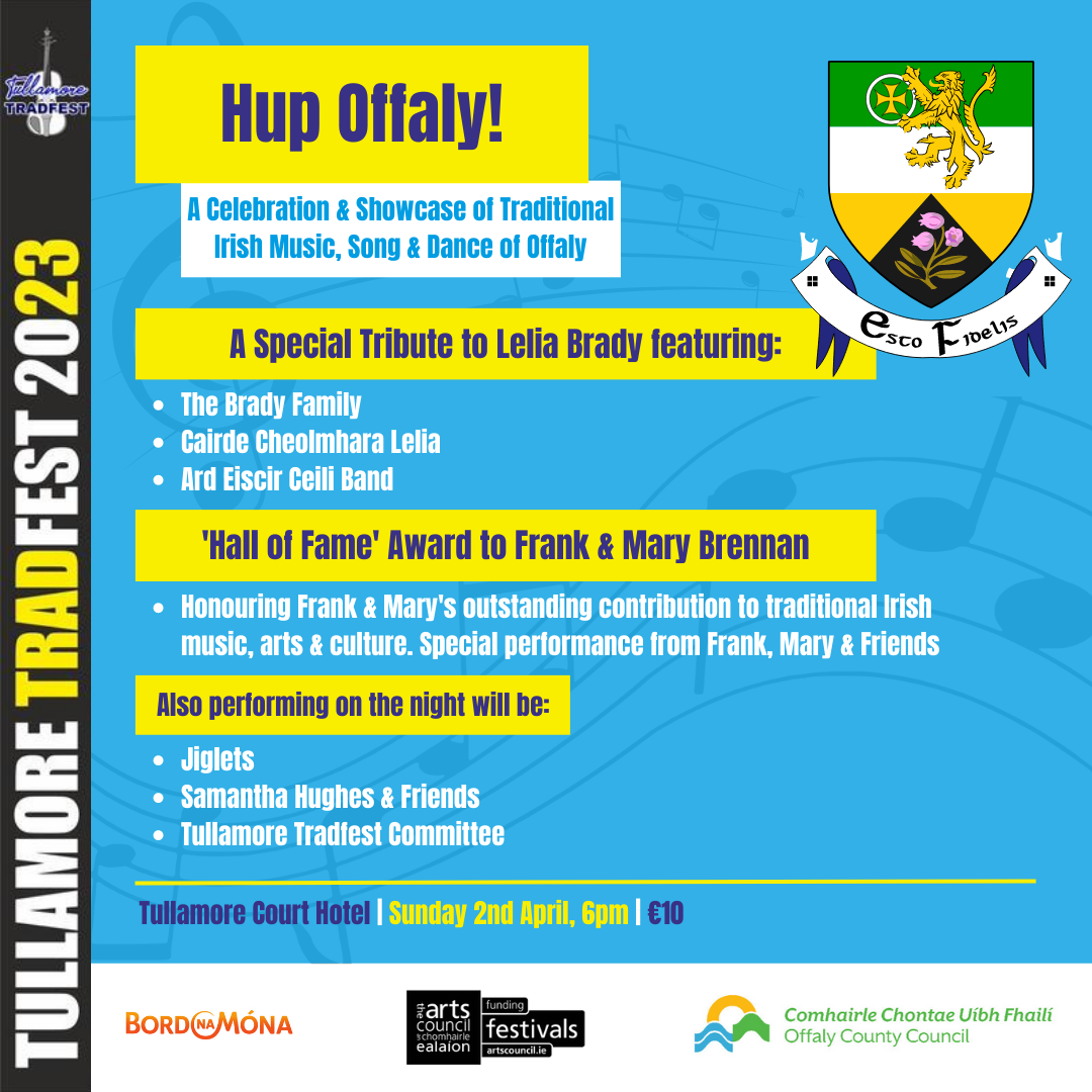 This concert celebrates the traditional music of Offaly and those that have made an outstanding contribution to the traditional music scene locally. This year there is a special tribute to the late Lelia Brady by members of her family, friends and Árd Escir Céilí Band.