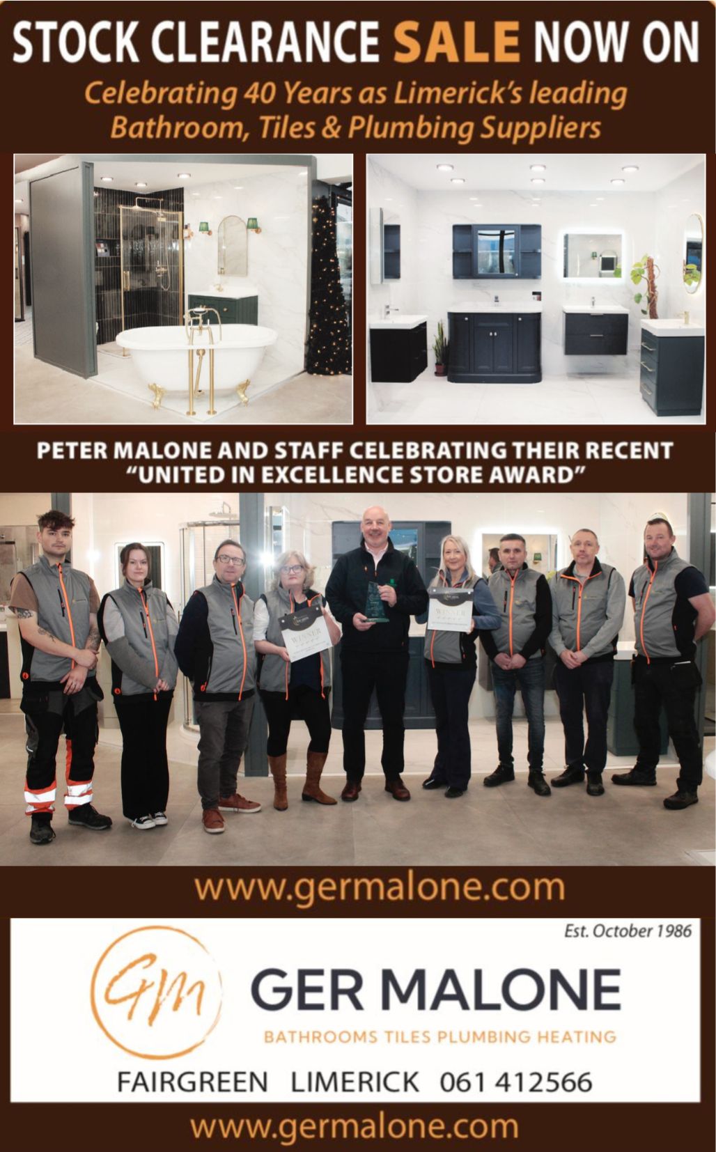 Ger Malone Bathrooms, Tiles, Plumbing and Heating, located in the Fairgreen, Limerick, are celebrating a major achievement after being honoured with two prestigious awards at the United Hardware United in Excellence Awards 2025.