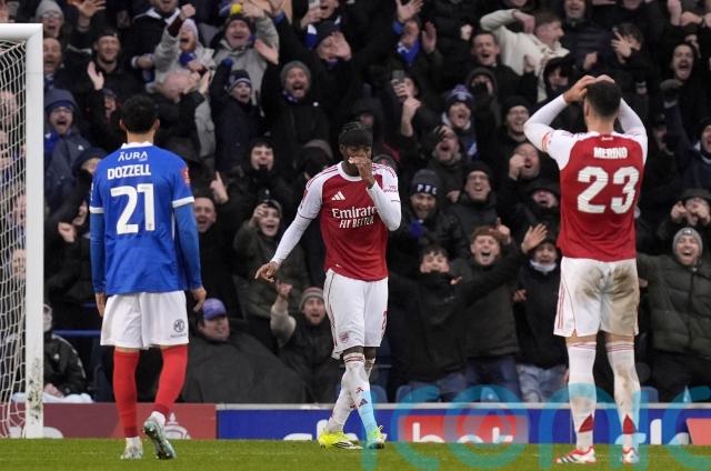 Mikel Arteta’s Premier League leaders fell behind less than three minutes into a rain-soaked contest at Fratton Park when Pompey captain Colby Bishop finished from close range.